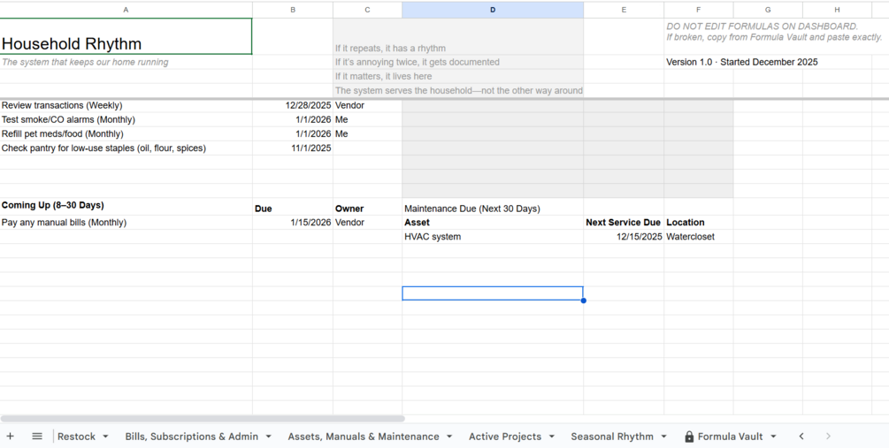 Household Rhythm is a Google Sheets–based home management system that replaces mental load with clear, predictable rhythms—so nothing important relies on memory.